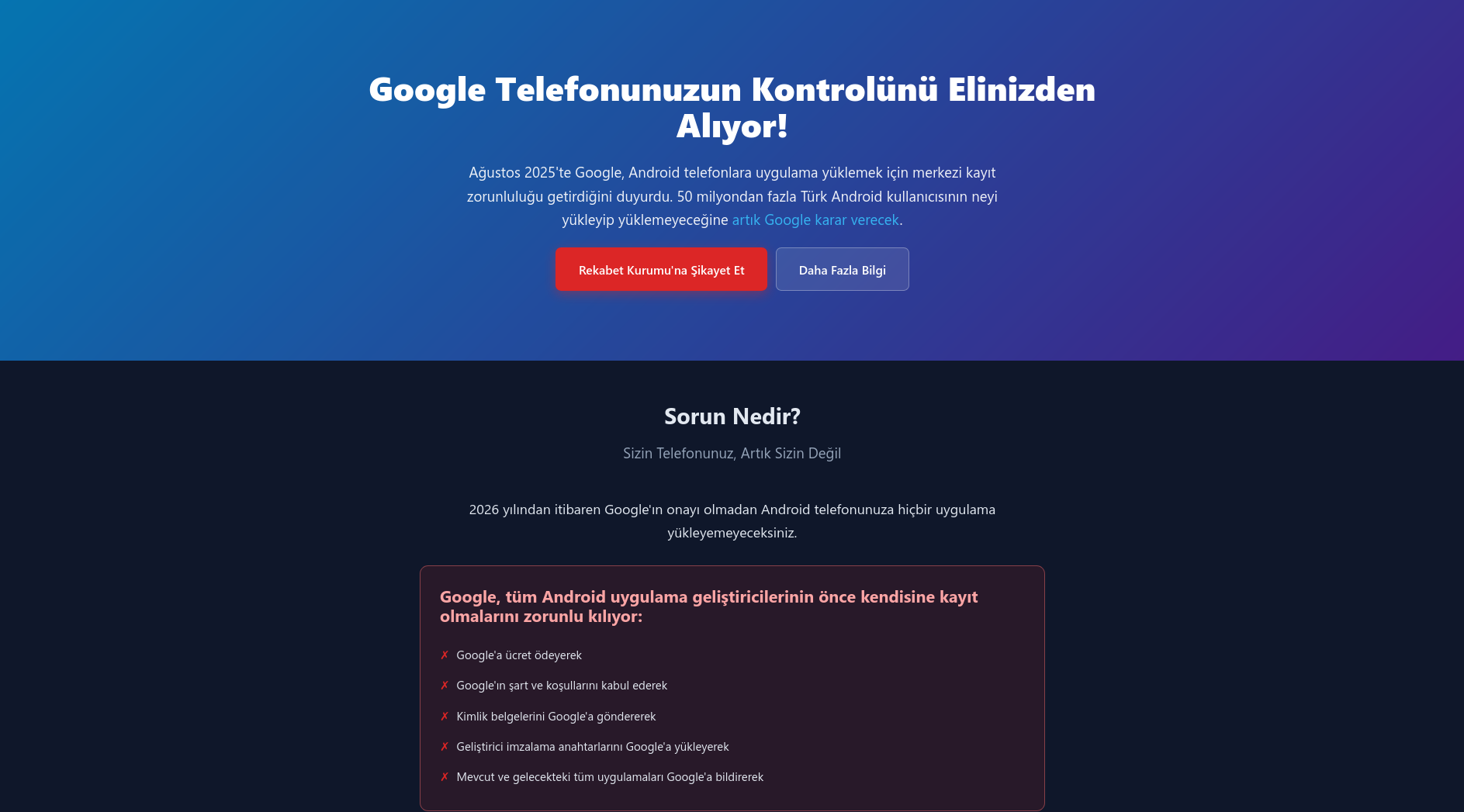 Sayfada Rekabet Kurumu'na nasıl şikayette bulunabileceğinizi anlatan hazır bir metin de mevcut. Bu metni kopyalayıp yapıştırabilir veya kendinize göre düzenleyebilirsiniz. Birkaç dakikanızı ayırarak yapacağınız bu şikayet konunun yetkililerin gündemine taşınması için büyük önem taşıyor. Lütfen bu konuyu Android kullanan arkadaşlarınızla da paylaşın.