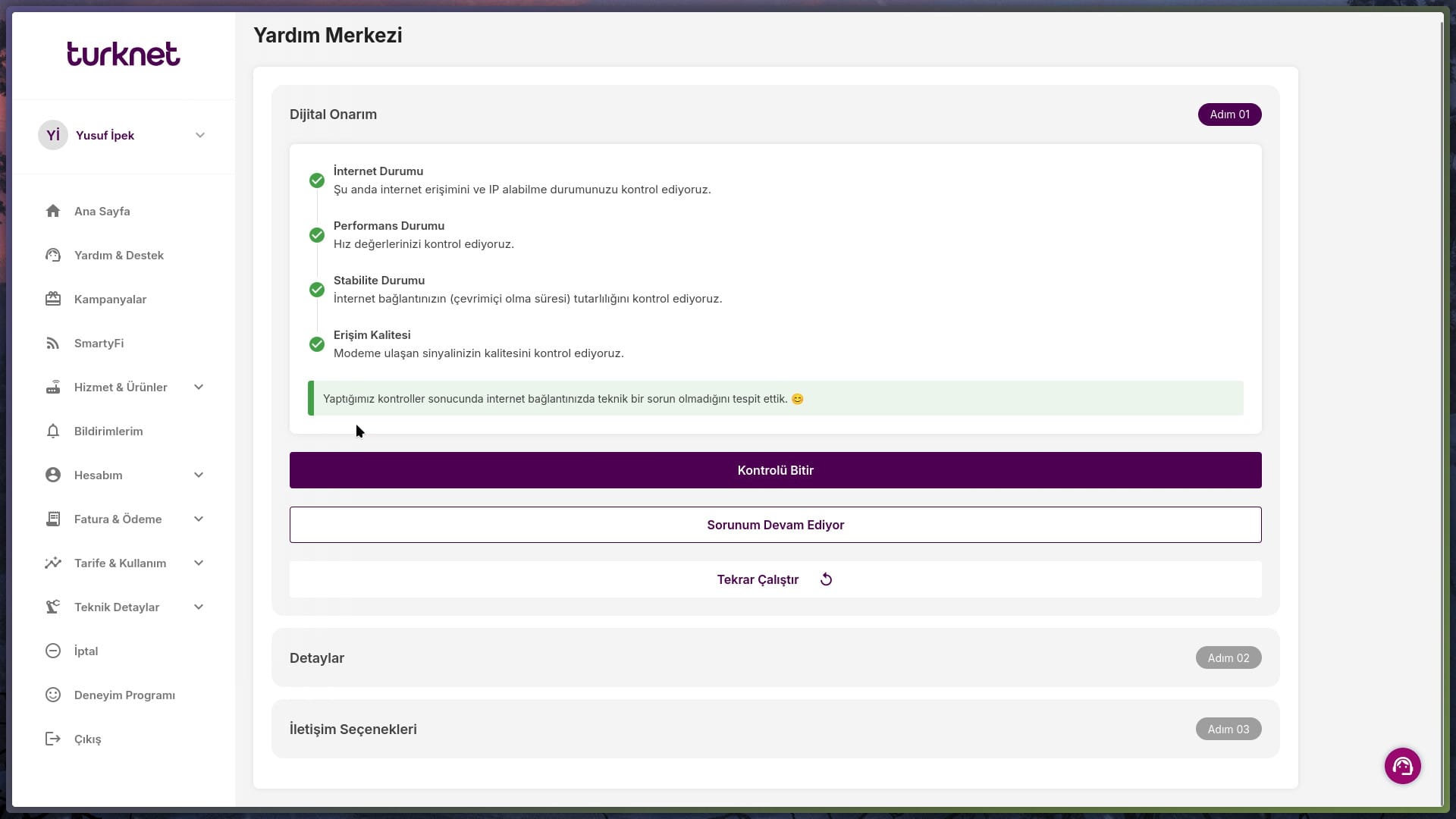 TurkNet destek sistemiyle de fark yaratıyor. Bir destek kaydı açmadan önce sistem otomatik olarak internetinizin durumunu tarıyor ve sorunu tespit etmeye çalışıyor.