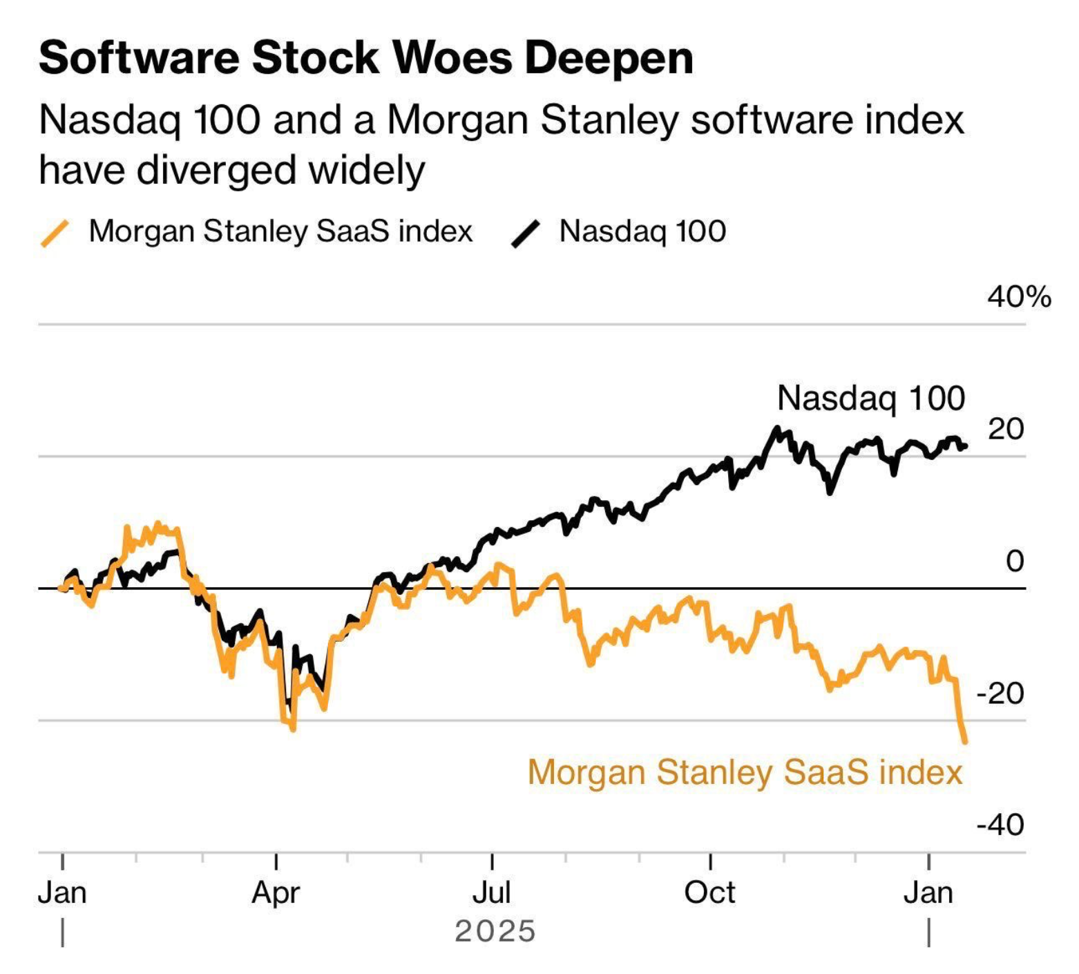 Yapay zeka sessiz sedasız B2B modelini öldürmeye başladı bile. Rakamlar ortada; Morgan Stanley’nin SaaS endeksi Aralık ayından beri Nasdaq’ın tam 40 puan gerisinde kalmış durumda.
